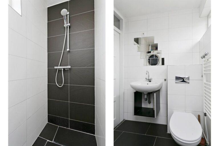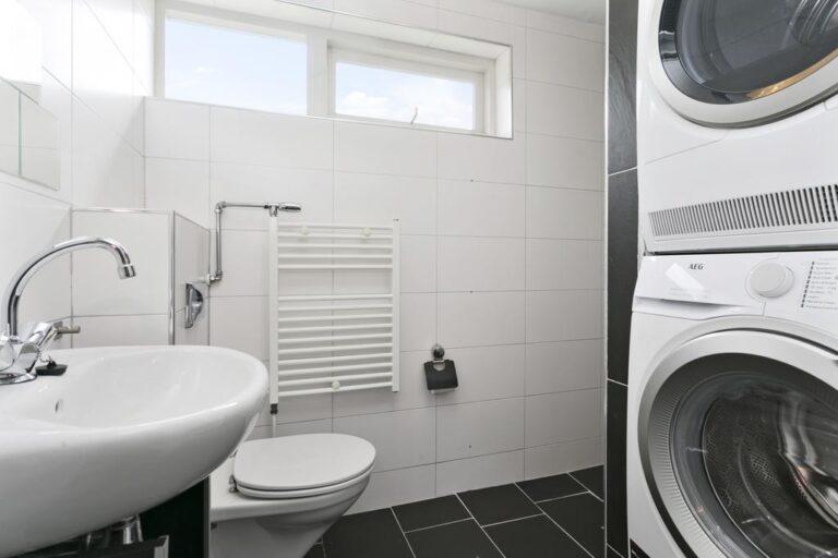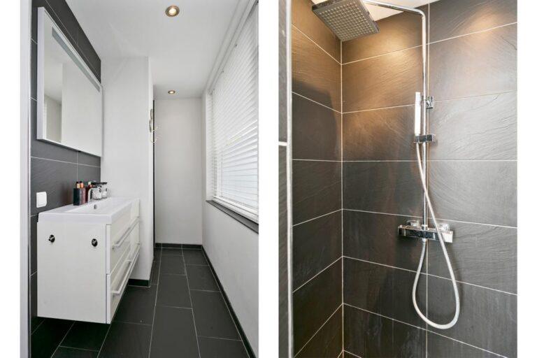 Badkamer twee beschikt over een wastafel, zwevend closet, inloop douche en biedt plek aan de wasmachine en droger.
