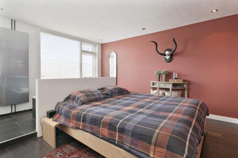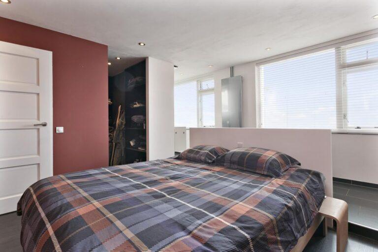 De master bedroom is gelegen aan de achterzijde van de woning en beschikt naast de badkamer ook over een gave inloopkast. Deze luxe aangrenzende badkamer beschikt over een ligbad, ruime inloopdouche en wastafel.