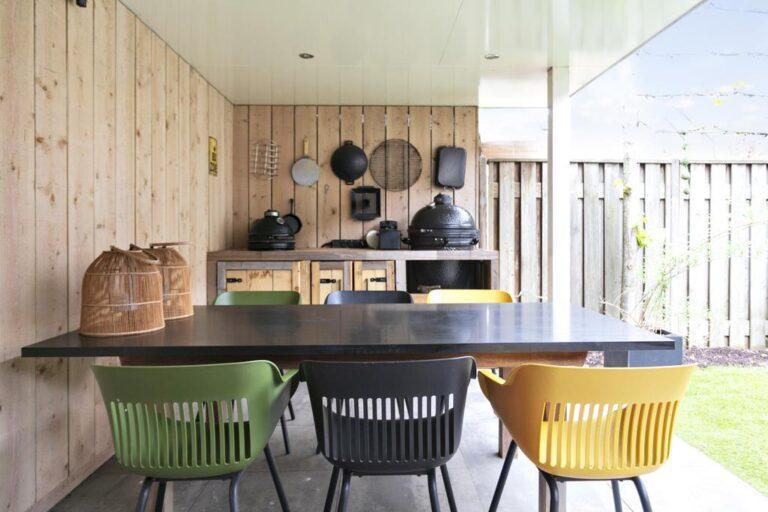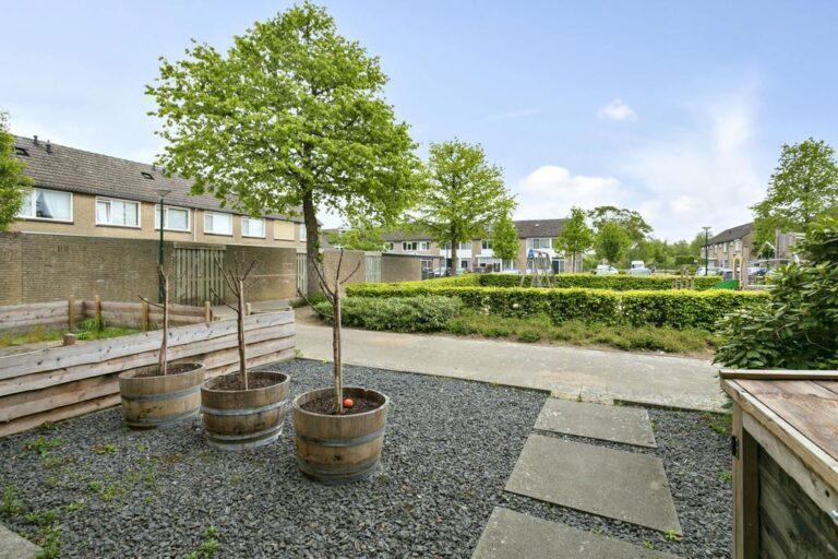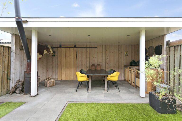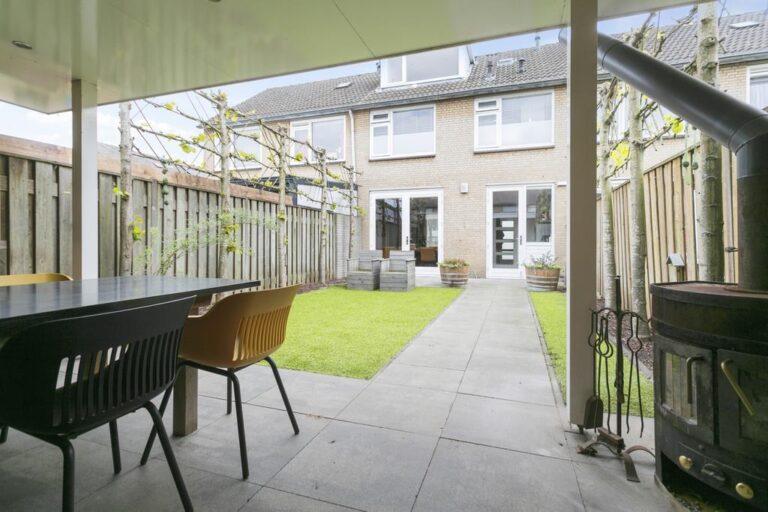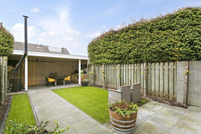 De strak vormgegeven achtertuin is zeer onderhoudsvriendelijk. Deze beschikt over een fijn terras met een overkapping waar je het makkelijk een dagje volhoudt! De tuin is verder ingericht met aan weerszijde borders met leilindes voor extra privacy, een kunstgras gazon en ruime tuinberging. Middels een poort is de achtergelegen brandgang toegankelijk.