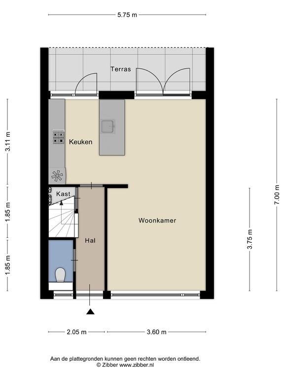 Entree aan de voorzijde geeft toegang tot de hal met toiletruimte, trapopgang en trapkast (met meterkast). De hal geeft toegang tot de keuken.
