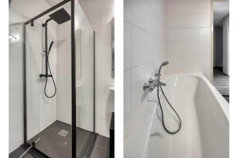 De badkamer is compleet uitgerust en biedt zowel een ligbad als een aparte douche. De neutrale afwerking maakt het een tijdloze en fijne ruimte om te gebruiken.