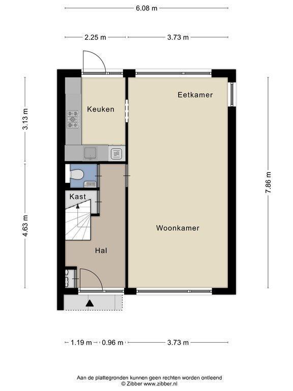 Via de ingang aan de voorzijde betreden we de woning, hier vind je de hal met daarin de meterkast, toiletruimte en de trap die toegang geeft tot de eerste verdieping. Via de hal gaan we door naar de woonkamer.