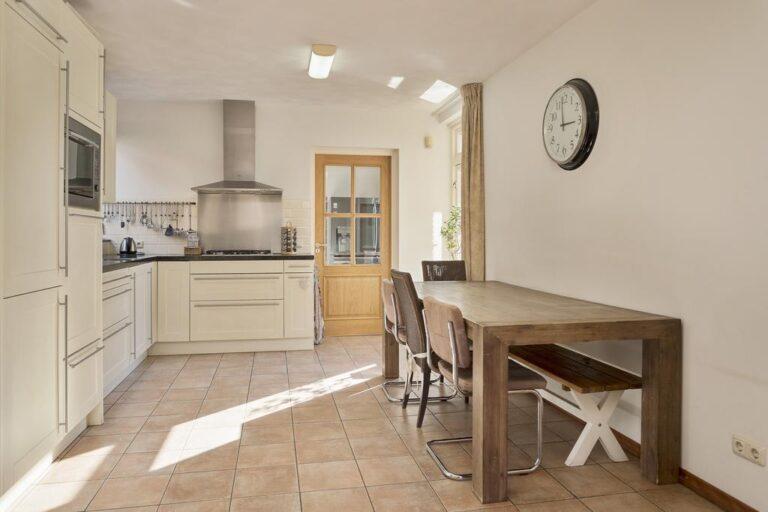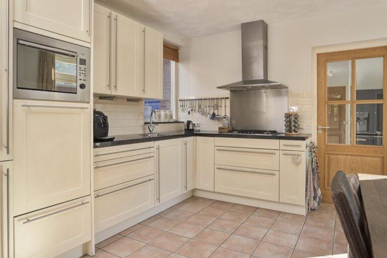 De ruime leefkeuken is vanuit de hal en de woonkamer bereikbaar. Er is een lichte keuken met granieten werkblad in hoekopstelling geplaatst, deze beschikt over een 5-pits kookplaat en afzuigkap, koelkast en aparte vriezer, een combimagnetron en een vaatwasser die op praktische hoogte geplaatst is. Naast al de bergruimte die de keuken zelf heeft, tref je in de keuken ook de toegang aan tot de verdiepte trapkast met enorm veel opslagruimte.