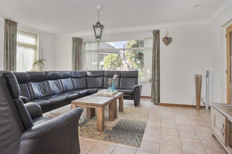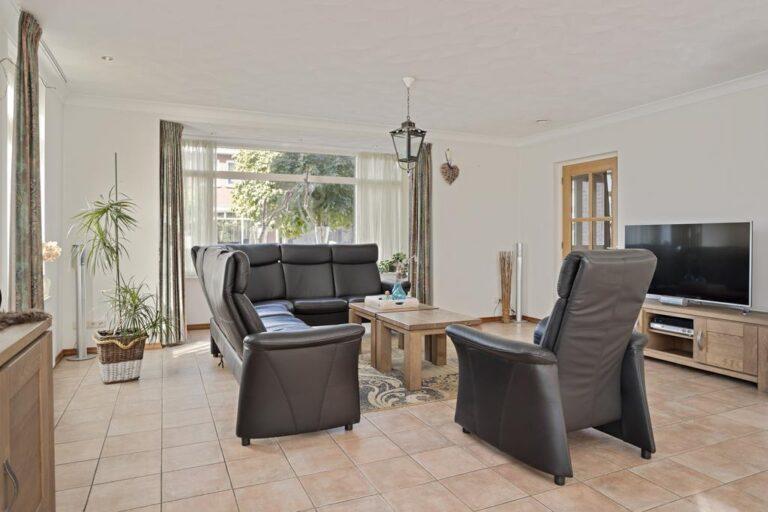 Vanuit de hal aan de voorzijde van de woning heb je toegang tot de keuken en de woonkamer. De ruime woonkamer is aan de voorzijde voorzien van een erker en aan de achterzijde van openslaande deuren naar de heerlijke tuin. Ook aan de lange zijde van de woonkamer vind je 2 ramen waardoor de woonkamer heerlijk licht is. De woonkamer heeft gestukte wanden en een schuurwerk plafond. De vloer is voorzien van een tegelvloer met vloerverwarming. Heerlijk comfortabel!