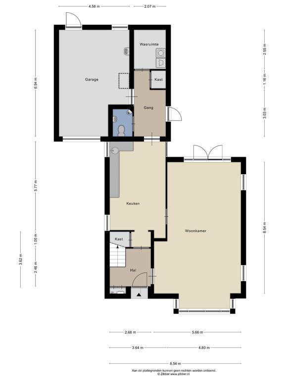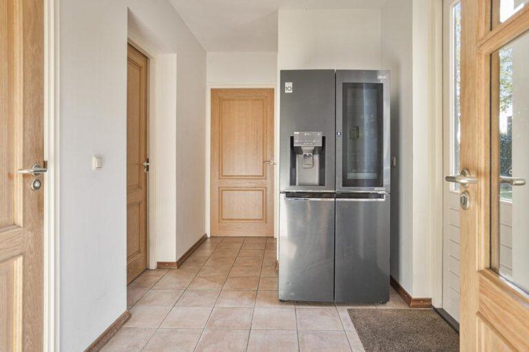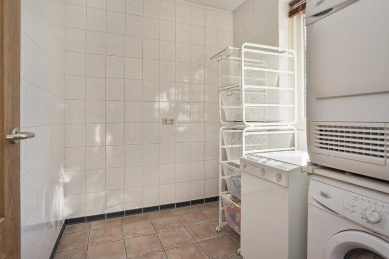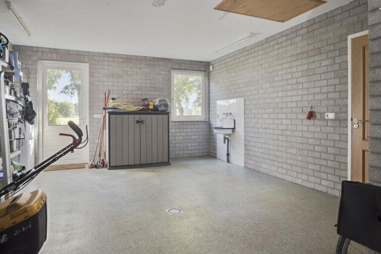 Achter de keuken bevindt zich een ruime hal van waaruit je naar de achtertuin kunt, toegang hebt tot de royale toiletruimte met laaghangend toilet en urinoir, de bijkeuken en de garage. De bijkeuken is ruim genoeg voor het plaatsen van de wasmachine en wasdroger, droogrek, strijkplank etc.. Daarnaast is er in de hal nog een flinke bergkast. De ruime garage is voorzien van een elektrische kanteldeur. De vloer is epoxy vloer en heeft een praktische afvoer. Er is krachtstroom aanwezig en in de garage bevindt zich ook de stofzuiginstallatie en de waterontkalker. Boven de garage is nog een bergzolder waar zich ook de CV installatie bevindt.