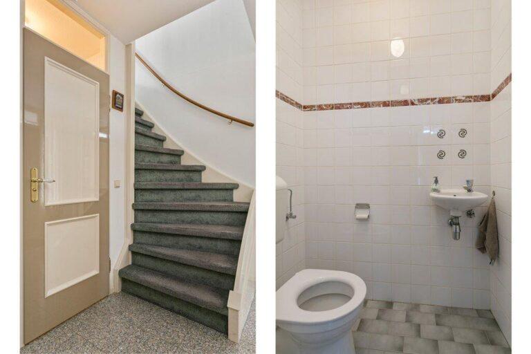 Met het oog op logees is er natuurlijk niets zo fijn als een tweede badkamer. Deze nette geheel betegelde badkamer beschikt over een toilet, douche en wastafel met fraai meubel.