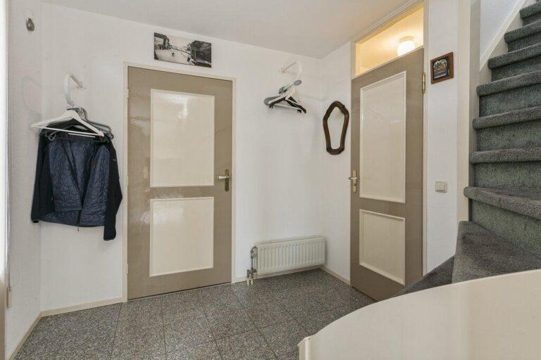 De aan de voorzijde gelegen overdekte entree geeft toegang tot de hal met trapopgang en toiletruimte. De hal geeft toegang tot zowel de inpandige garage als de woonkamer. Wij vervolgen onze weg naar de woonkamer.
