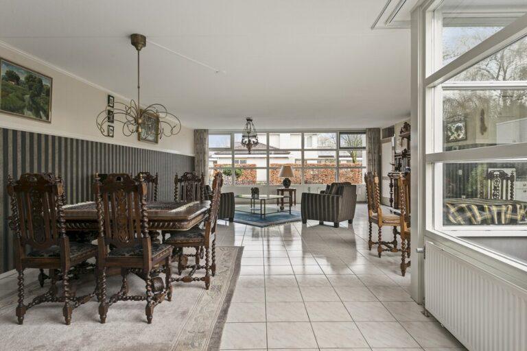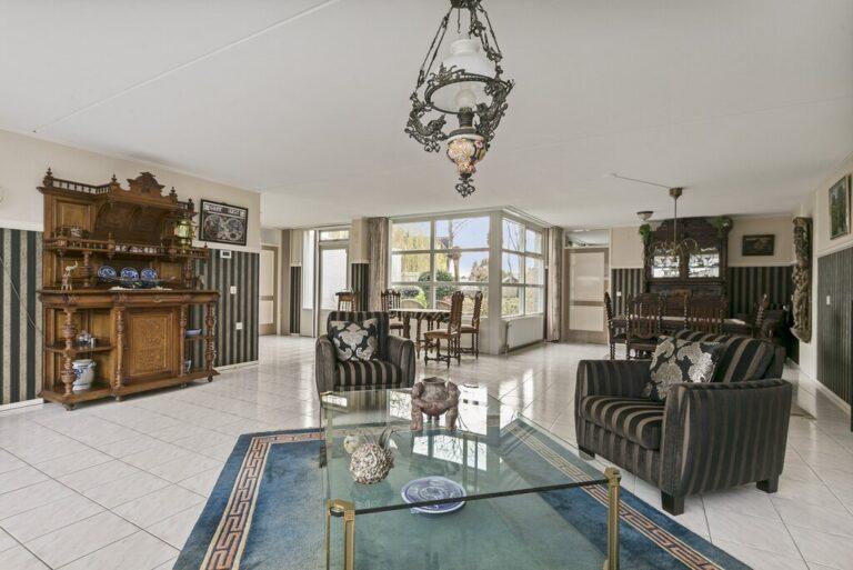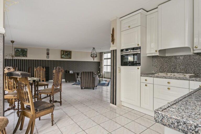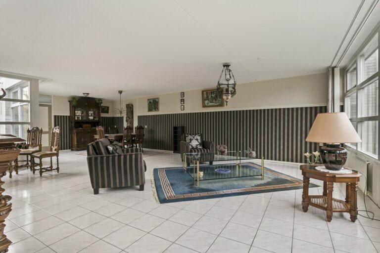 Het eerste wat direct opvalt wanneer we de woonkamer binnenkomen is de enorme hoeveelheid ruimte en licht! Grote raampartijen aan zowel de voor- als achterzijde geven een fraai zicht op de mooie omgeving. De woonkamer is afgewerkt met behangen wanden, een spuitwerk plafond en lichte tegelvloer met vloerverwarming. De woonkamer staat in open verbinding met de keuken en geeft toegang tot de slaapvleugel.