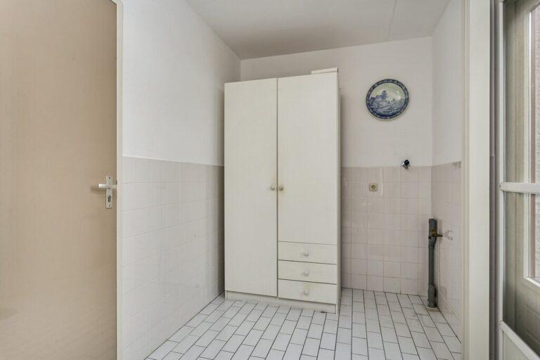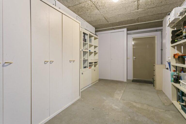 De fijne bijkeuken is natuurlijk de uitgelezen plek voor wat extra voorraad of voor het opbergen van de grotere spullen. Ook vinden we hier de aansluitingen voor het witgoed. De bijkeuken geeft toegang tot de inpandige garage en de tuin.