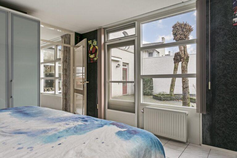 Misschien wel het grootste pluspunt van deze woning is de aanwezigheid van een ruime slaapkamer en nette badkamer op de begane grond. De slaapkamer beschikt over dezelfde lichte tegelvloer en is afgewerkt met behangen wanden en een spuitwerk plafond.