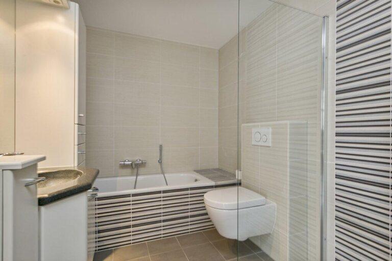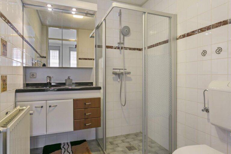 Direct aan de slaapkamer vinden we de in 2018 vernieuwde badkamer. De badkamer beschikt over zowel een ruime inloopdouche als een ligbad, een wastafel met ruim meubel en wandclosetpot.