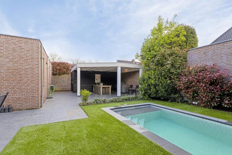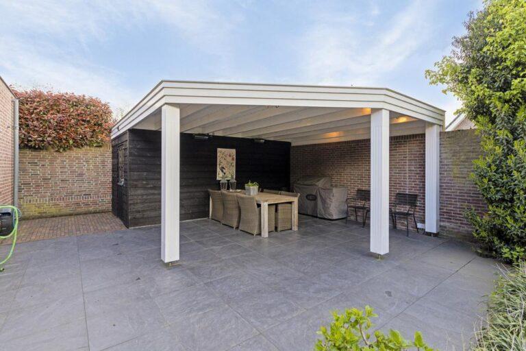 De voortuin is fraai aangelegd met bomen en een border, terwijl de achtertuin op het zuidoosten is gelegen en beschikt over een achterom aan beide zijden van de woning. Hier vind je een verhard terras, grasgazon, een riante overkapping met berging en een zwembad ideaal voor ontspanning en gezelligheid.