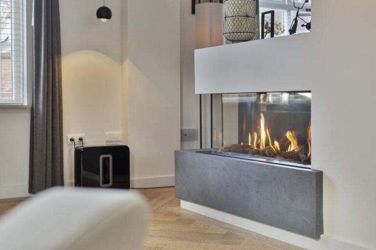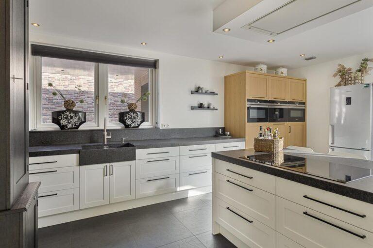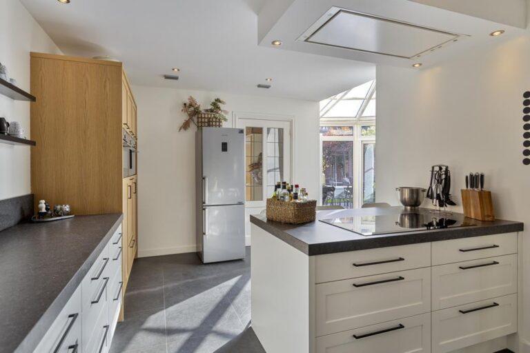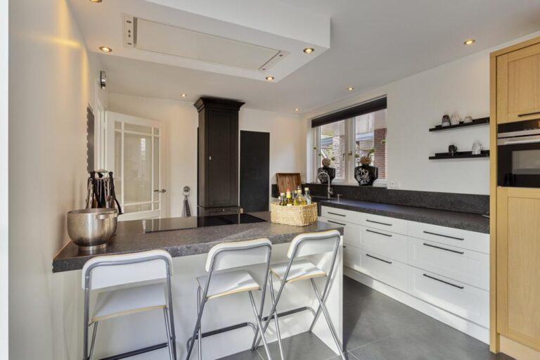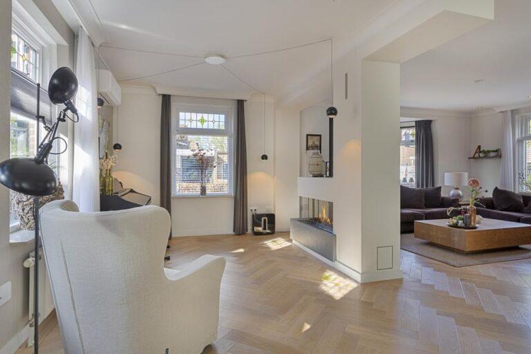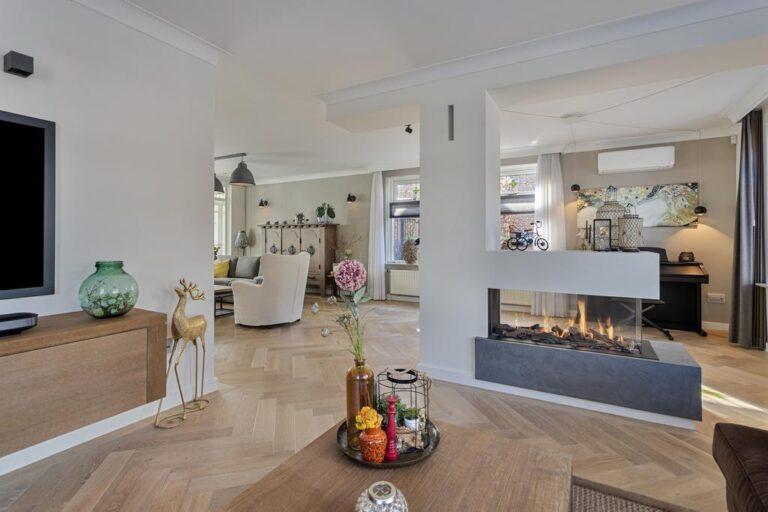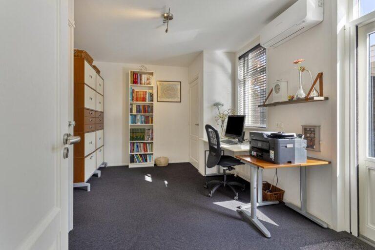 Bij binnenkomst betreed je een lichte hal met een ruime garderobehoek en toegang tot de meterkast, toiletruimte en trapopgang. De woonkamer is royaal met een zitgedeelte aan de voorzijde en een eetgedeelte aan de achterzijde, grenzend aan de moderne keuken. In het midden van de woonkamer bevindt zich een sfeervolle openhaard partij. De keuken is compleet uitgerust met hoogwaardige apparatuur en biedt veel werk- en bergruimte. De bijkeuken met witgoedaansluitingen is in een fijne achterom. Vanuit hier kom je in de werkkamer waar de airco zorgt voor een fijn werkklimaat. De serre vormt de verbinding tussen de eetkamer en de keuken en is een geweldige plek om samen te komen en te borrelen. Via openslaande deuren kom je in de zonnige tuin, compleet met een ruime stenen berging en overkapping voor de heerlijke zomerse avonden. De beneden verdieping is grotendeels voorzien van airco.