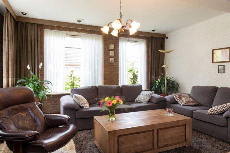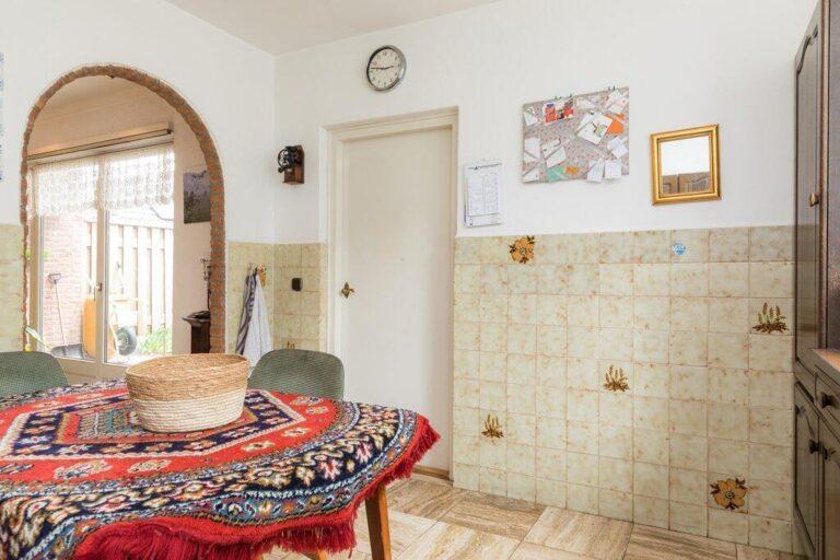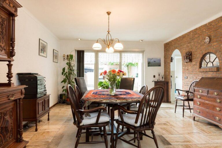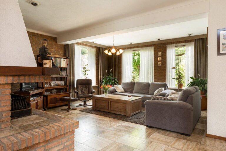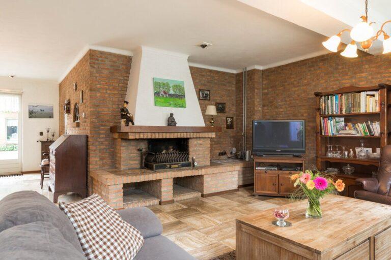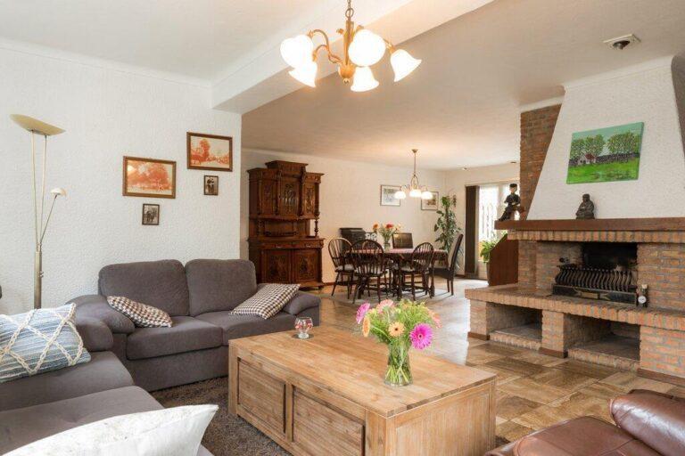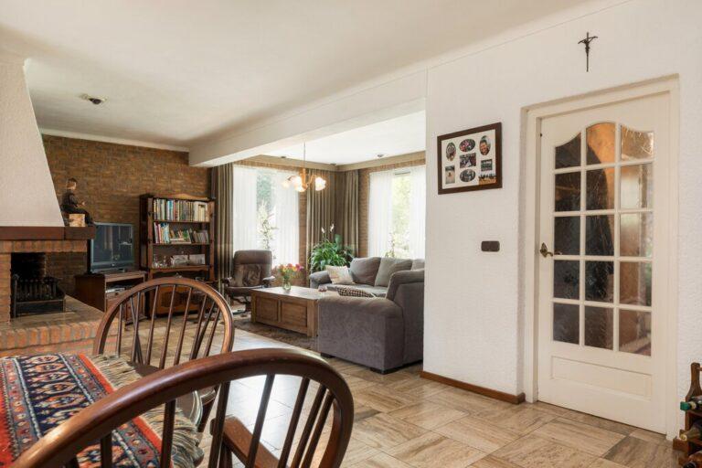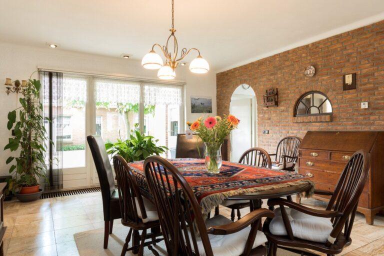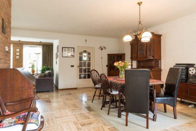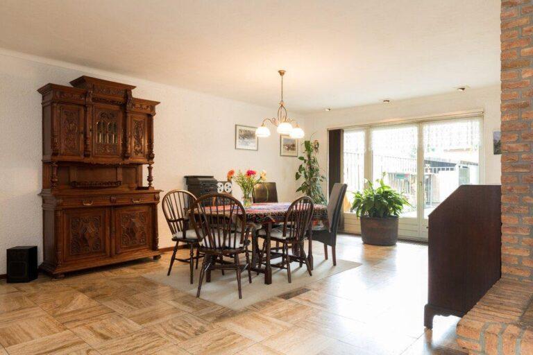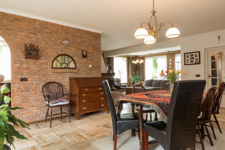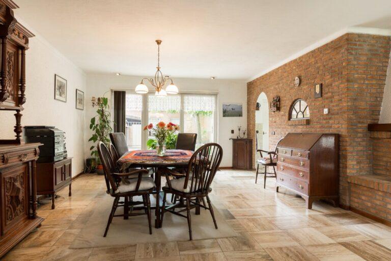Dat deze woning serieus groot is wordt hier al snel duidelijk. De woonkamer met gezellige zithoek en open haard is gelegen aan de voorzijde en geeft goed zicht op de mooie buurt. De ruime eetkamer vinden we aan de tuinzijde bij de keuken. De woonkamer is afgewerkt met een lichte tegelvloer, deels spachtelputz- deels schoonmetsel werkwanden en gestucte plafonds.