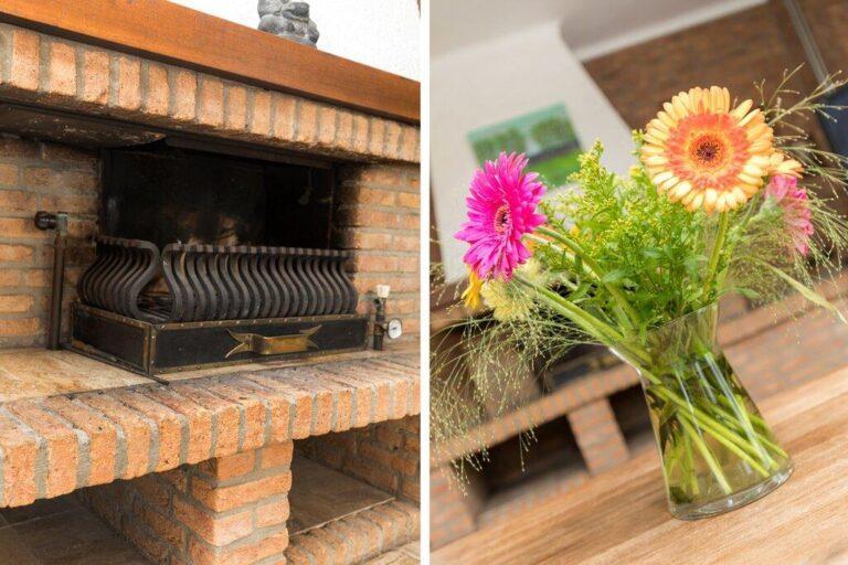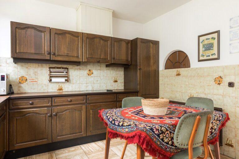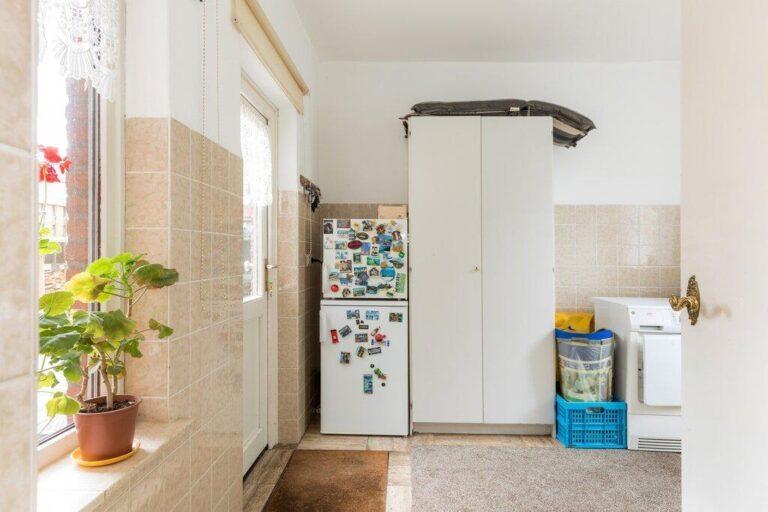 Direct aan de keuken vinden we een handige bijkeuken, ideaal voor het plaatsen van een extra koelkast/vriezer, de wasmachine en kasten voor wat extra vooraad. In de bijkeuken vinden we ook de toiletruimte en hebben we toegang tot de tuin.