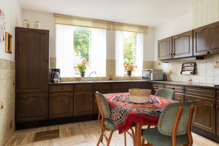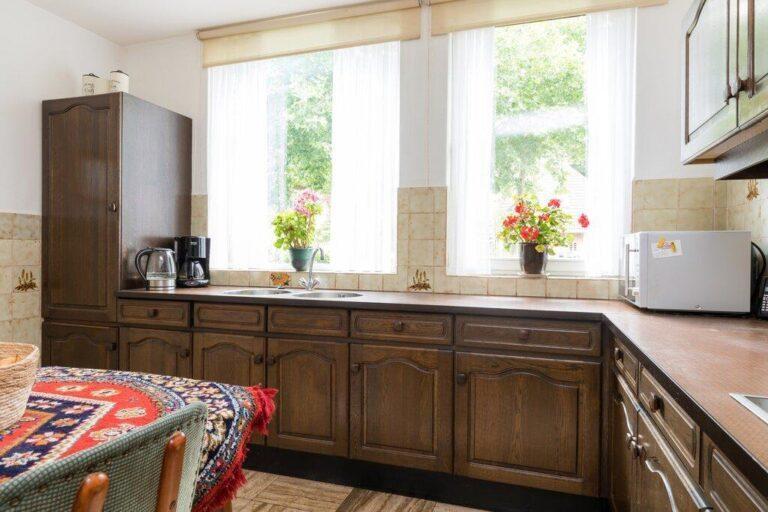 Vanuit de eetkamer hebben we een open verbinding naar de keuken. Hier bevindt zich een ruime keuken in hoekopstelling met een enorme hoeveelheid werk- en bergruimte. De keuken is verder uitgerust met een dubbele spoelbak, inbouw koelkast en een elektrische kookplaat met afzuigkap. De keuken is ruim genoeg voor een ontbijttafel. Met het zicht op het park is dit een goede plek om de dag te beginnen.