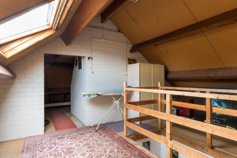 Nog een vaste trap geeft toegang tot de ruime zolder. De zolder is verdeeld in twee delen en doet momenteel voornamelijk dienst als bergzolder.