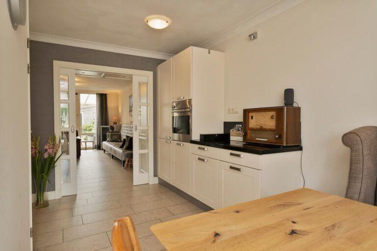 In de keuken kan de kookfanaat zijn geluk niet op! Wat heb je hier een enorme hoeveelheid berg- en werkruimte om de meest gezellige etentjes te geven. De hoekopstelling met inbouw koelkast, vaatwasser, spoelbak en 5-pits gaskookplaat met afzuigkap aan de voorzijde van de woning en nog een tweede rechte opstelling met combi-oven en berg- en werkruimte. De keuken is gescheiden van de woonkamer middels fraaie en suite kasten. Aan tafel!