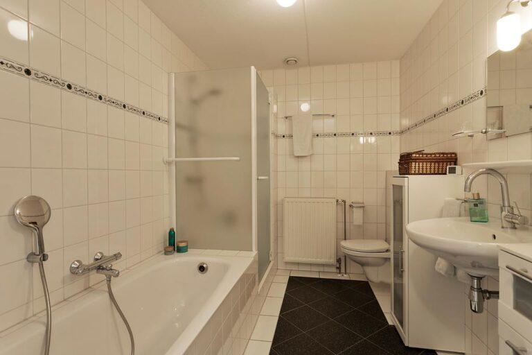 De geheel betegelde badkamer is gelegen in het hart van de woning. De badkamer beschikt over zowel een ligbad als een douche, wandclosetpot en een wastafel.