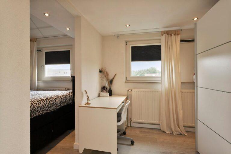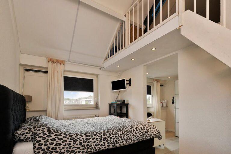 De volgende verrassing vinden we op verdieping twee. Wat een enorm gave kamer is hier ontstaan, compleet met ruime kleedkamer, fraaie vide en enorm hoge plafonds! Ook deze kamer beschikt over een fraaie laminaatvloer en gestucte wanden. De kamer beschikt tevens over airconditioning.
