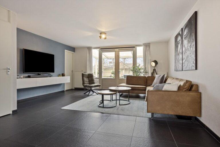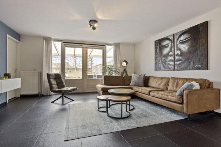 Vanuit de heerlijk lichte woonkamer heb je door de grote raampartijen een goed zicht op wat zich in de achtertuin afspeelt. De gehele begane grond is strak afgewerkt met een antracietgrijze tegelvloer, gestucte wanden en plafonds. Vanuit de woonkamer heb je toegang tot een handige trapkast, de tuin en het portaal richting bijkeuken en berging (c.q. garage).