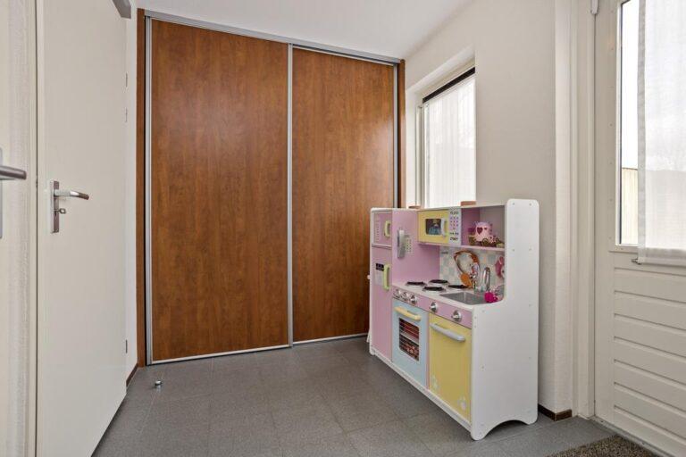 We beginnen in de hal met garderoberuimte, toilet, trapopgang en meterkast (met krachtstroom). Vanuit de hal hebben we toegang tot de keuken en woonkamer. Op de vloer in de hal liggen tegels. De wanden zijn gestuct en het plafond is v.v. spuitwerk.