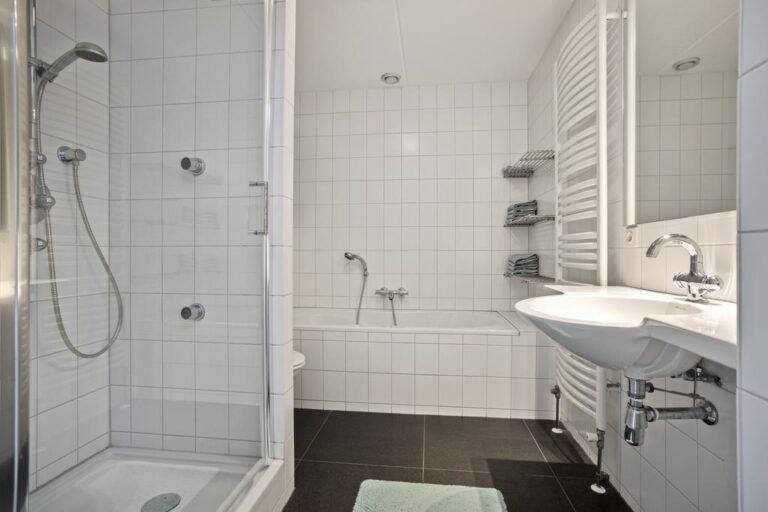 De geheel betegelde badkamer is gelegen in het hart van de woning. De badkamer beschikt over zowel een ligbad als een douche met zijsproeiers, wandcloset, wastafel en een designradiator.