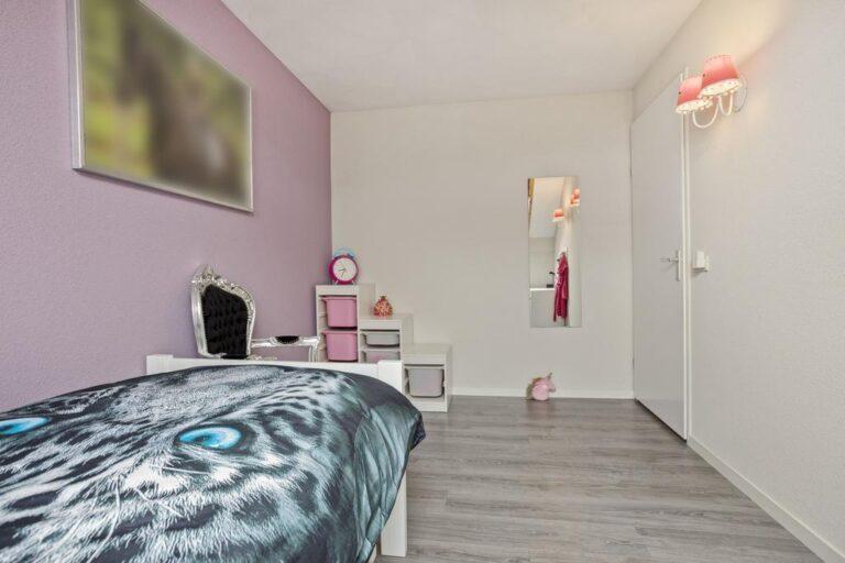 Aan de voorzijde van de woning vinden we de enorme ouderslaapkamer. Wat een fijne kamer met de ruimte voor een kastenwand en toegang tot het balkon. De overige twee kamers zijn gelegen aan de achterzijde van de woning en hebben leuke speelse raampartijen en houten details. De kamers zijn allen afgewerkt met een laminaat vloer, spuitwerk plafonds en gestucte wanden.