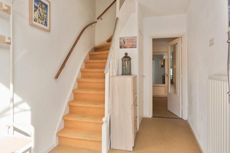 Via de aan de voorzijde gelegen entree betreden we de ruime hal met trapopgang, meterkast en handige bergkast. Vanuit de hal hebben we toegang tot de keuken.
