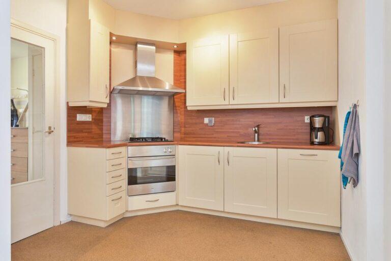 Deze nette keuken bestaat voornamelijk uit een rechte opstelling met een prettige hoeveelheid berg- en werkruimte. De uitrusting van de keuken bestaat uit een 4-pits gaskookplaat met afzuigkap, oven, inbouwkoelkast en vaatwasser. De keuken staat in open verbinding met de woonkamer en heeft ook toegang tot de bijkeuken.
