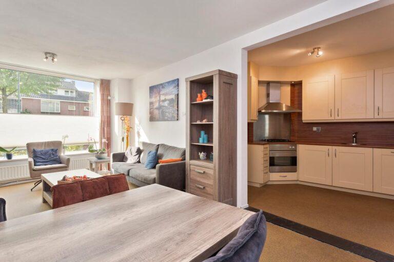 Een grote raampartij aan de voorzijde (met screen) zorgt voor een lekker lichte woonkamer. De woonkamer is bovendien strak afgewerkt met een korreltapijt vloer (kan dienen als ondervloer) en strak gestucte wanden en plafond. De woonkamer biedt voldoende ruimte voor een fijne zithoek aan de voorzijde en eethoek in het hart van de woning.