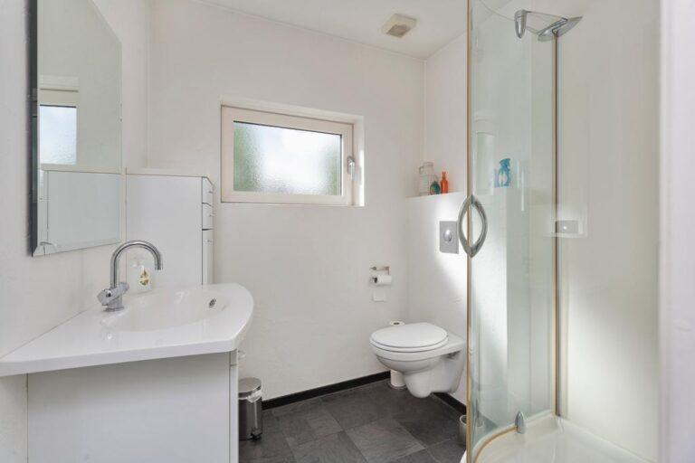 De nette badkamer is gelegen aan de voorzijde van de woning. Deze beschikt over een douche, toilet en wastafel met fraai meubel. De badkamer is afgewerkt met gestucte wanden en plafond en een fraaie donkere tegelvloer.