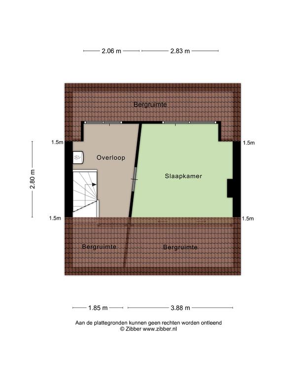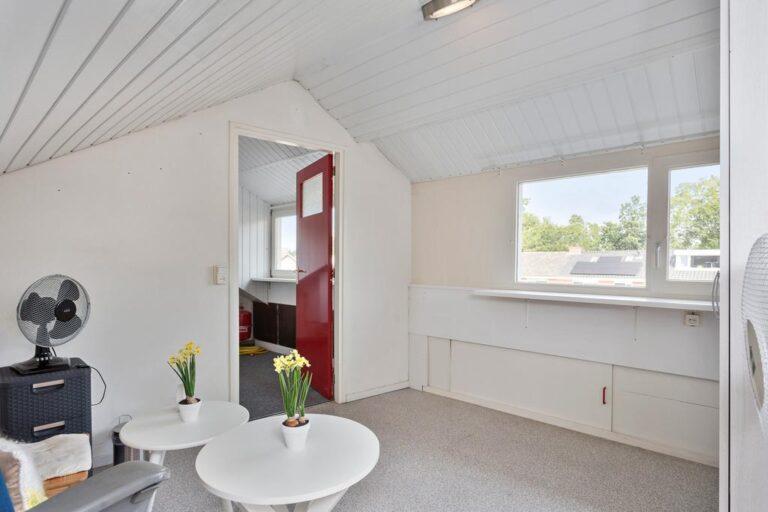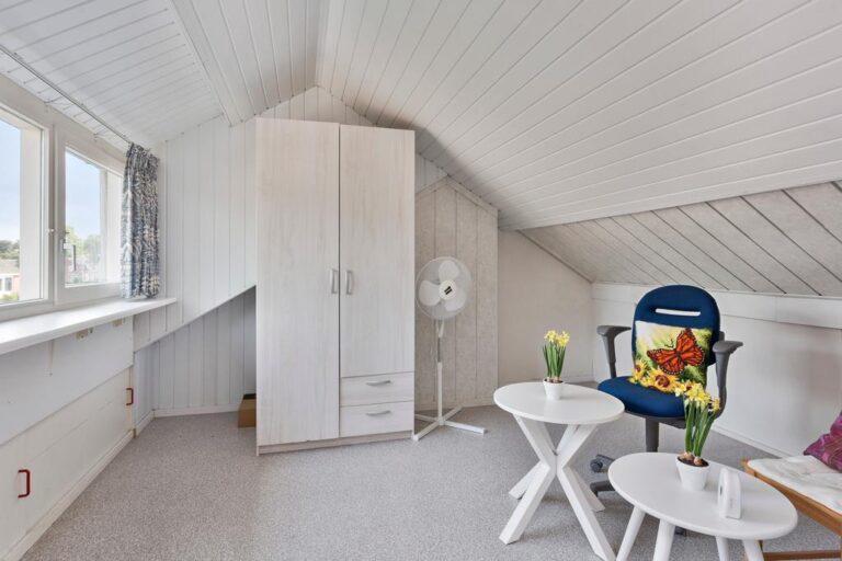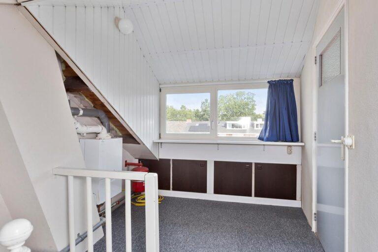 Een tweede vaste trap brengt ons op de overloop van verdieping twee. En hier vinden we, door de aanwezigheid van een flinke dakopbouw, nog eens ontzettend veel ruimte. De overloop met ketelopstelling geeft namelijk toegang tot een lekker ruime vierde slaapkamer. Ook deze slaapkamer is afgewerkt met een linoleum vloer. Onder de schuine kanten bevindt zich nog een enorme hoeveelheid handige bergruimte.