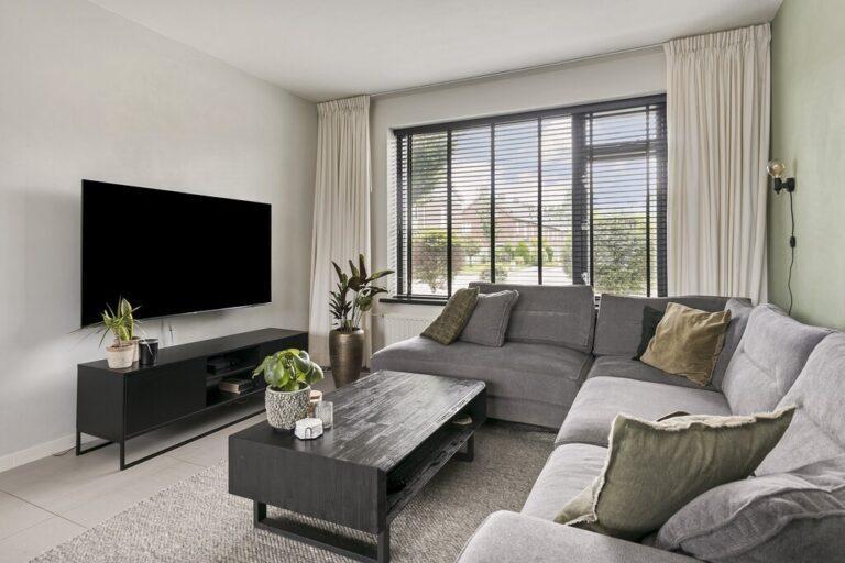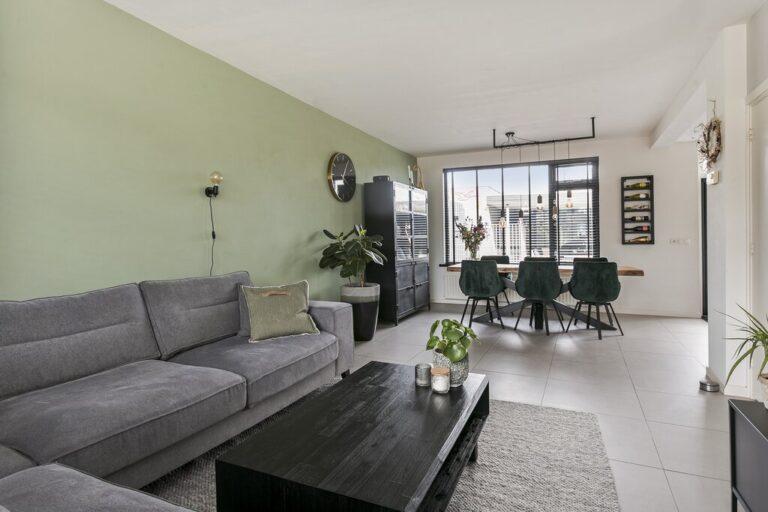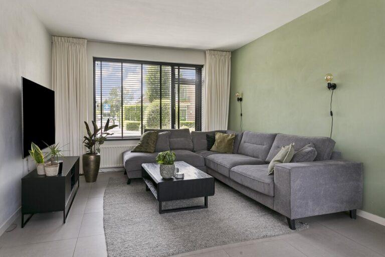Binnenkomend in de woonkamer wordt het direct duidelijk: Dit is af! Een heerlijk lichte ruimte afgewerkt met strak gestucte wanden en plafonds en een fraaie lichte tegelvloer. De woonkamer staat in open verbinding met de keuken.