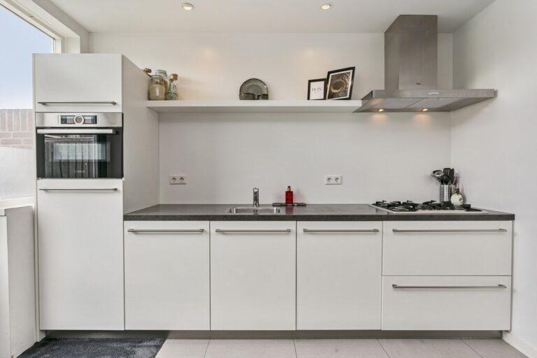 De in lengte opstelling geplaatste moderne keuken (2017) is v.v. een 5-pits gasfornuis met afzuigkap, combi-oven, spoelbak en vaatwasser. De keuken is afgewerkt met dezelfde strak gestucte wanden, plafonds met inbouwverlichting en de nette tegelvloer. Aan tafel!