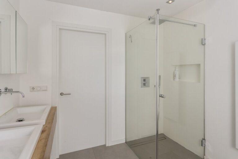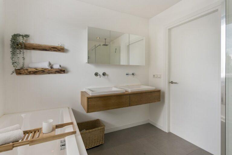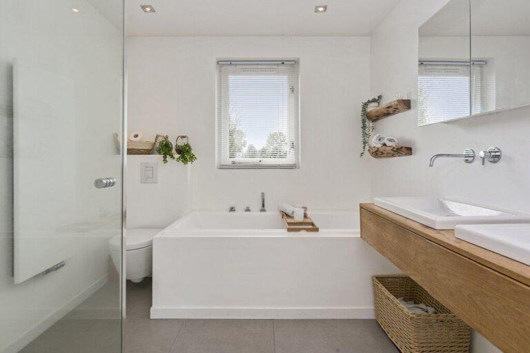 Ook de strakke badkamer (2017) stelt zeker niet teleur! Deze beschikt namelijk over een riant ligbad, inloopdouche, dubbele wastafel in fraai eiken houten meubel en toilet. De fraaie kleuren van de grijze tegelvloer, het frisse wit en hout maakt het een plaatje.