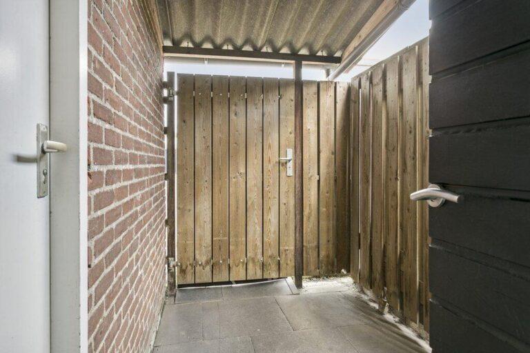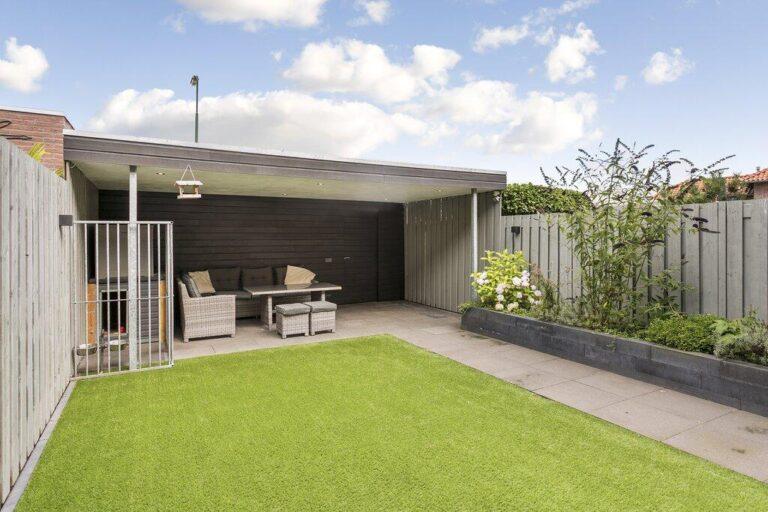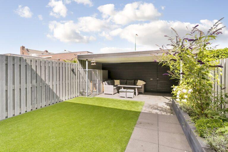 Achter het huis vinden we een fraai aangelegde tuin. Deze tuin is vooral gemaakt om in te genieten. De onderhoudsvriendelijke tuin is namelijk aangelegd met een riant (kunstgras)gazon, nette bestrating en een riante border met vaste beplanting voor het nodige groen. Na een dag hard werken is er geen betere plek dan onder de fijne overkapping op de achterzijde van het perceel.