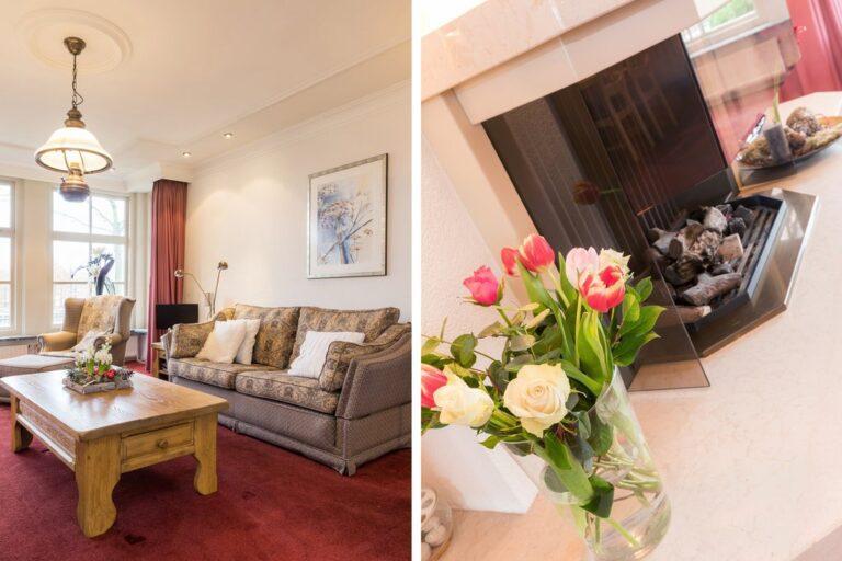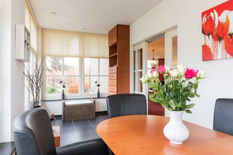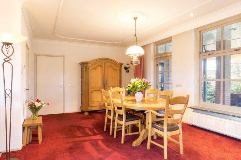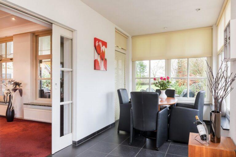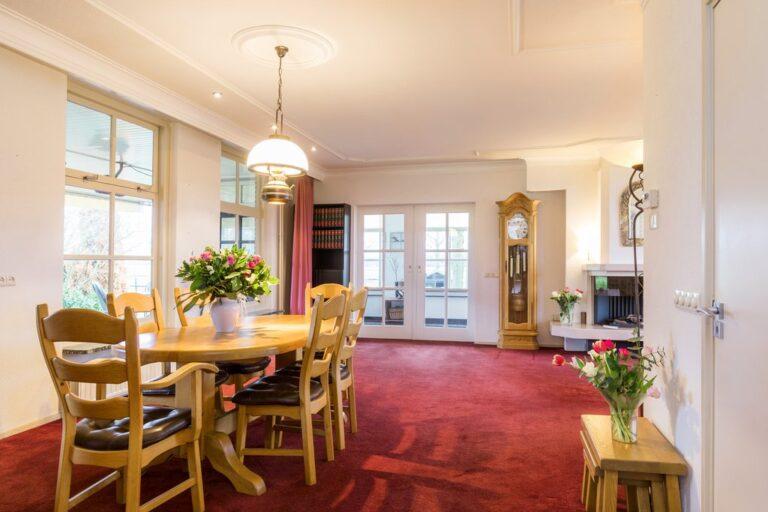 Vanuit de ruime L-vormige living en tuinkamer heb je een prachtig zicht op wat zich buiten afspeelt. ’s Winters zit je binnen goed bij de knisperende haard, maar in de zomer leef je hier buiten! De living is afgewerkt met stucwerk wanden en plafonds met fraai lijstwerk en inbouwverlichting, op de vloer vinden we vloerbedekking.