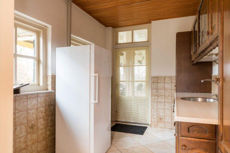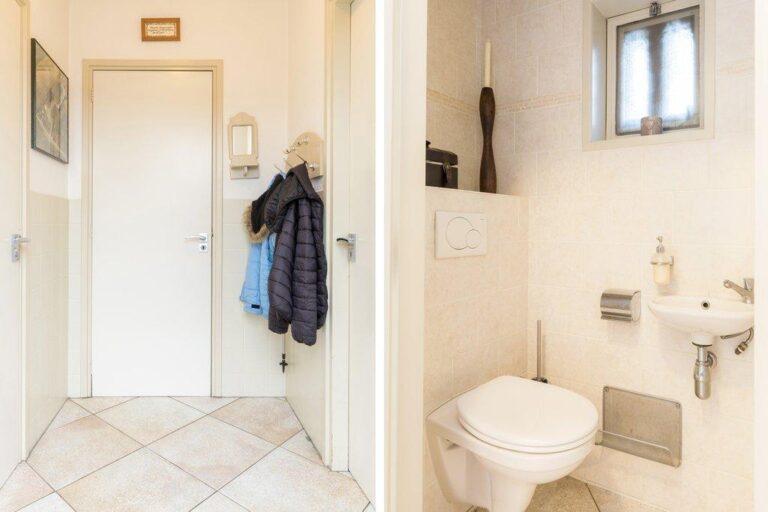 In de achterom vinden we de toiletruimte en deze geeft toegang tot de handige bijkeuken welke weer toegang geeft tot de tuin.