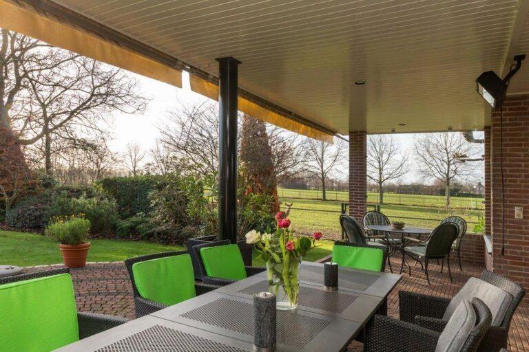 Misschien wel het mooiste bij deze woning is het leven dat je buiten hebt. Vanuit de ruime overkapping aan de achterzijde van het huis krijg je onder het genot van een drankje bezoek van de hertjes in de aangrenzende wei. Of je kijkt hoe de flamingo’s zich vermaken in het prachtig aangelegde vogelverblijf. Tel bij dit alles nog zo’n ruim 3 hectare weiland op voor de paarden en je beseft wat deze woning uniek maakt.