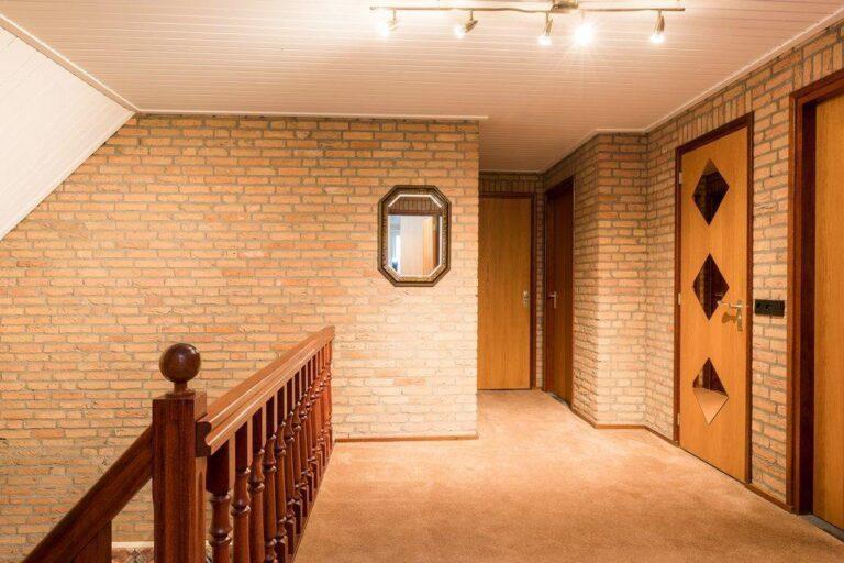 We parkeren de auto op de lekker ruime oprit en kiezen de entree aan de voorzijde dit keer. Die brengt ons in de ruime hal met garderobe, trappenhuis en fraaie vide. De hal geeft toegang tot de keuken en living, kelder en trap naar verdieping.