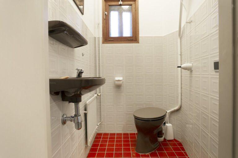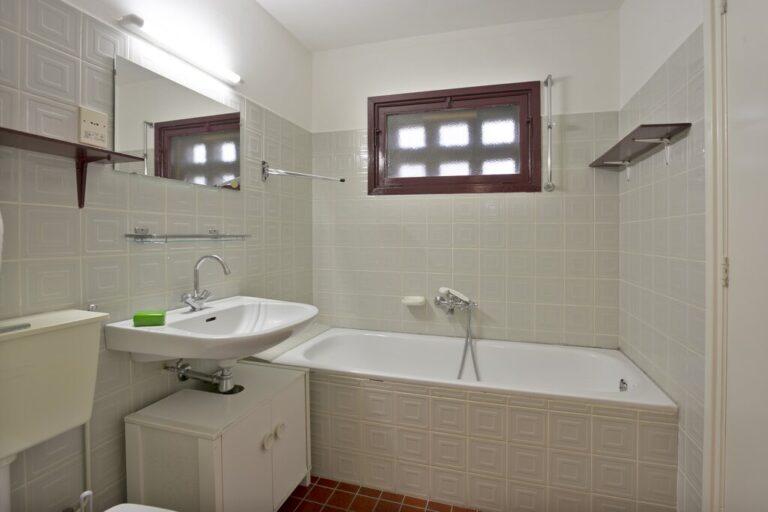De badkamer beschikt over een ligbad met douche in bad, wastafel met meubeltje en een toilet. De badkamer is grotendeels betegeld.