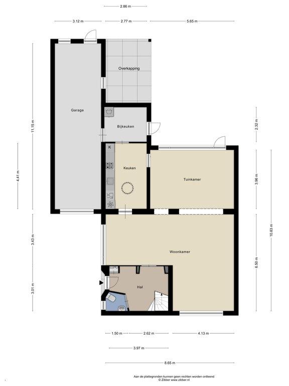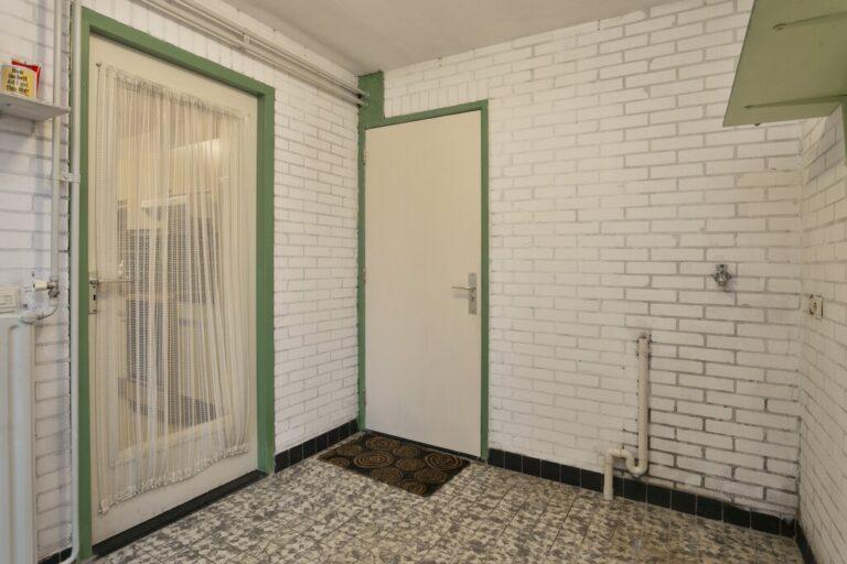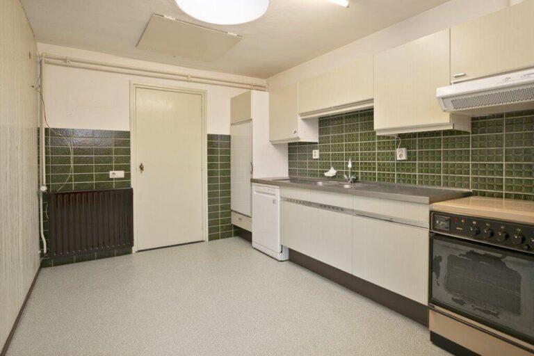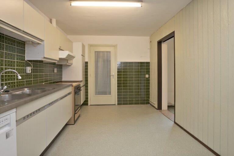 In de huidige situatie geeft de woonkamer toegang tot de dichte keuken met lichtkoepel en eenvoudige in lengte geplaatste keukenopstelling. Vanuit de keuken bereiken we de handige bijkeuken met witgoedaansluitingen. De bijkeuken geeft toegang tot de aangebouwde garage en tuin.