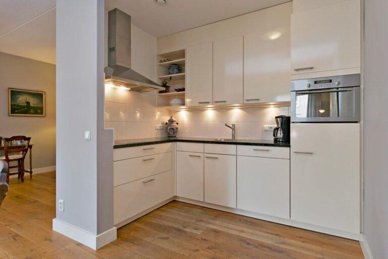 De keuken is geplaatst in hoekopstelling en beschikt o.a. over een keramische kookplaat met afzuigkap, combi magnetron, geïntegreerde koelkast, geïntegreerde vaatwasmachine en spoelbak. Boven- en onderkasten zorgen voor voldoende bergruimte.