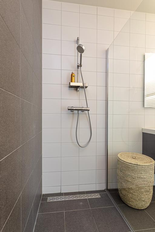 Through the hallway, you have access to the bathroom, a separate toilet, and an indoor storage room. The spacious bathroom is fully tiled and features a wide vanity unit, a designer radiator, and a spacious walk-in shower with an extended shower screen. The separate toilet is quite roomy and has a wall-mounted toilet. In the indoor storage room, you’ll find the heating system with a heat pump, as well as the washer and dryer connections.