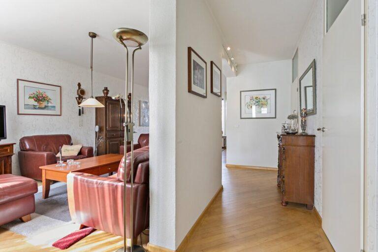 Via de ingang aan de voorzijde betreden we de woning, hier vind je als eerst een hal met daarin de garderobe en een toiletruimte. De toiletruimte is voorzien van een hangend closet en een wastafeltje. Terug in de hal vinden we een deur die ons toegang geeft tot de woonkamer.