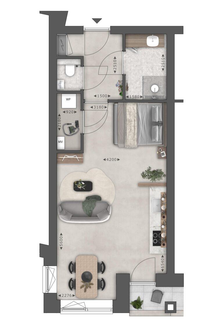 De appartementen zijn studio’s met de bouwnummer 3 t/m 8, gelegen op de begane grond aan de kant van het Steegje. De oppervlaktes zijn allemaal hetzelfde, nl ca. 41 m2. De entree is vanaf het complex met de hoofdingang aan de Vlas en Graan. Daar kom je in de centrale hal binnen, hier bevindt zich ook de lift en trap. Door de hal heen lopend kom je weer buiten aan de galerij. Hier bevinden zich ook de voordeuren en entree van de appartementen. Je komt binnen in de hal met toegang tot het toilet, badkamer en technische ruimte. Doorlopend kom je in de woonkamer, keuken en slapen, totaal 28 m2. Van hieruit is ook de buitenruimte te bereiken. Het appartement beschikt over gezamenlijke berging op de begane grond voor o.a. fietsen. De appartementen worden casco opgeleverd waarbij de wanden en vloer alsmede keuken en badkamer nog afgewerkt en geïnstalleerd dienen te worden. Een parkeerplaats in de kelder is er apart bij te kopen.