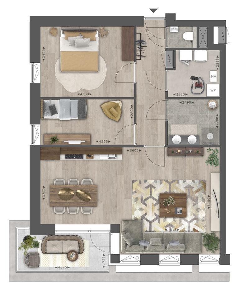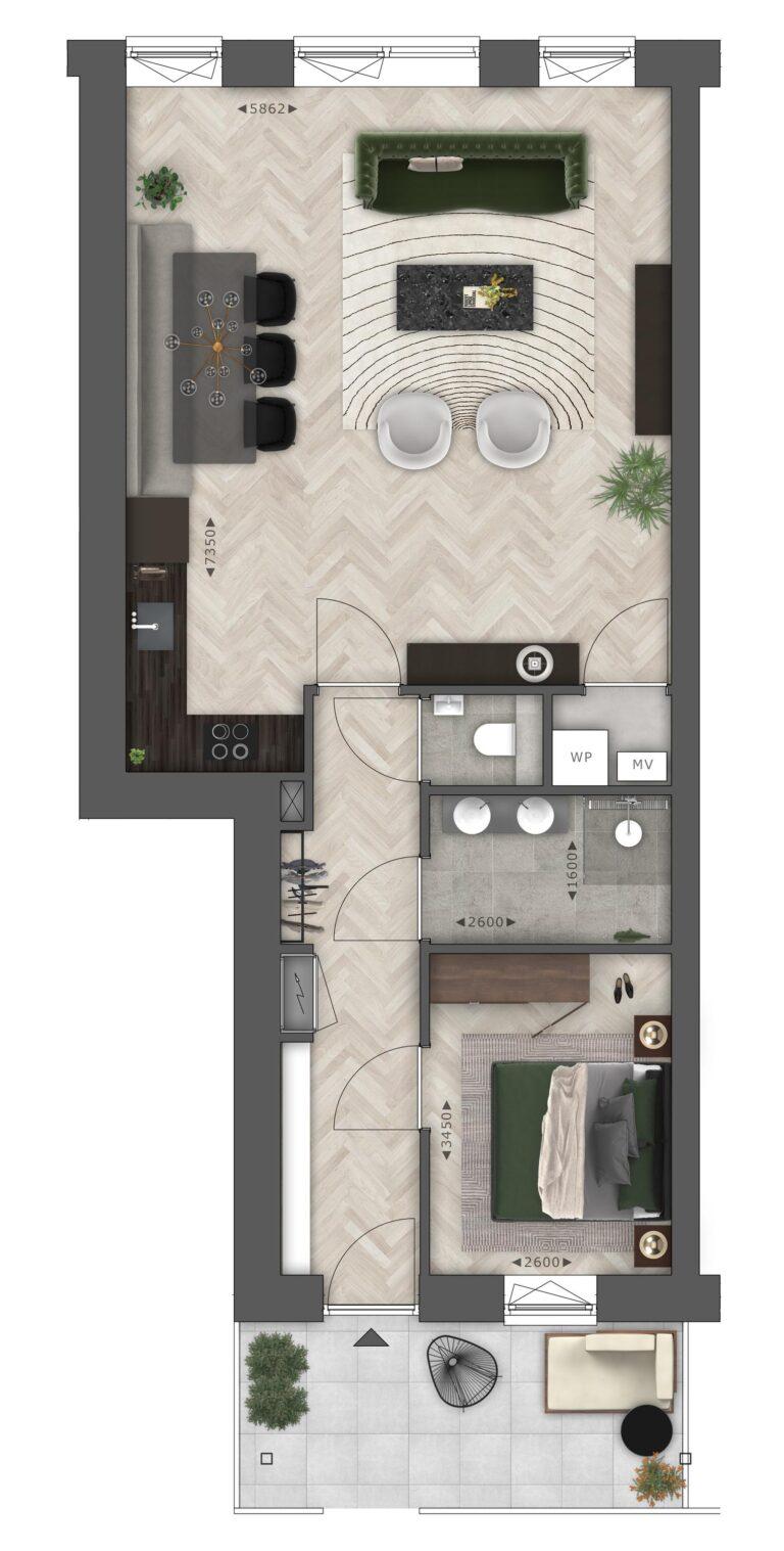 Dit voorbeeld appartement is een 3-Kamer appartement en ligt in STADS deel Kasteel, gesitueerd op de eerste verdieping met een fraaie uitkijk over de Vlas en Graan. Prachtig gelegen op een hoek met een balkon. Je komt binnen via de centrale hal met trap en lift naar de eigen ruime entree. Vanuit hier kom je in de badkamer, apart toilet, technische ruimte en slaapkamer (15 m2). Als je door loopt vanuit de hal kom je in de keuken/woonkamer. Deze is mooi ruim met een oppervlakte van 43 m2. Vanuit de woonkamer is de 2e slaapkamer te bereiken. De berging bevindt zich op de begane grond welke makkelijk bereikbaar is. Verder is er een mogelijkheid om een eigen parkeerplaats in de kelder bij te kopen.